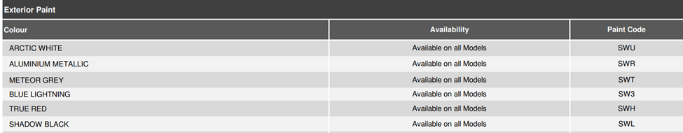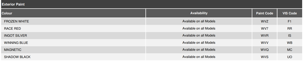 Should you have any further enquiries relating to paint codes, please contact your preferred Ford Dealership.